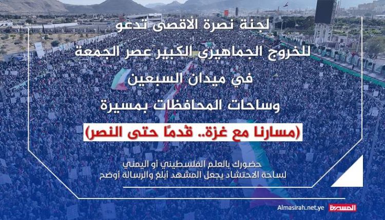 دعت لجنة نصرة الأقصى للخروج الجماهيري الكبير عصر الجمعة المقبلة بميدان السبعين في مسيرة (مسارنا مع غزة.. قُدماً حتى النصر).