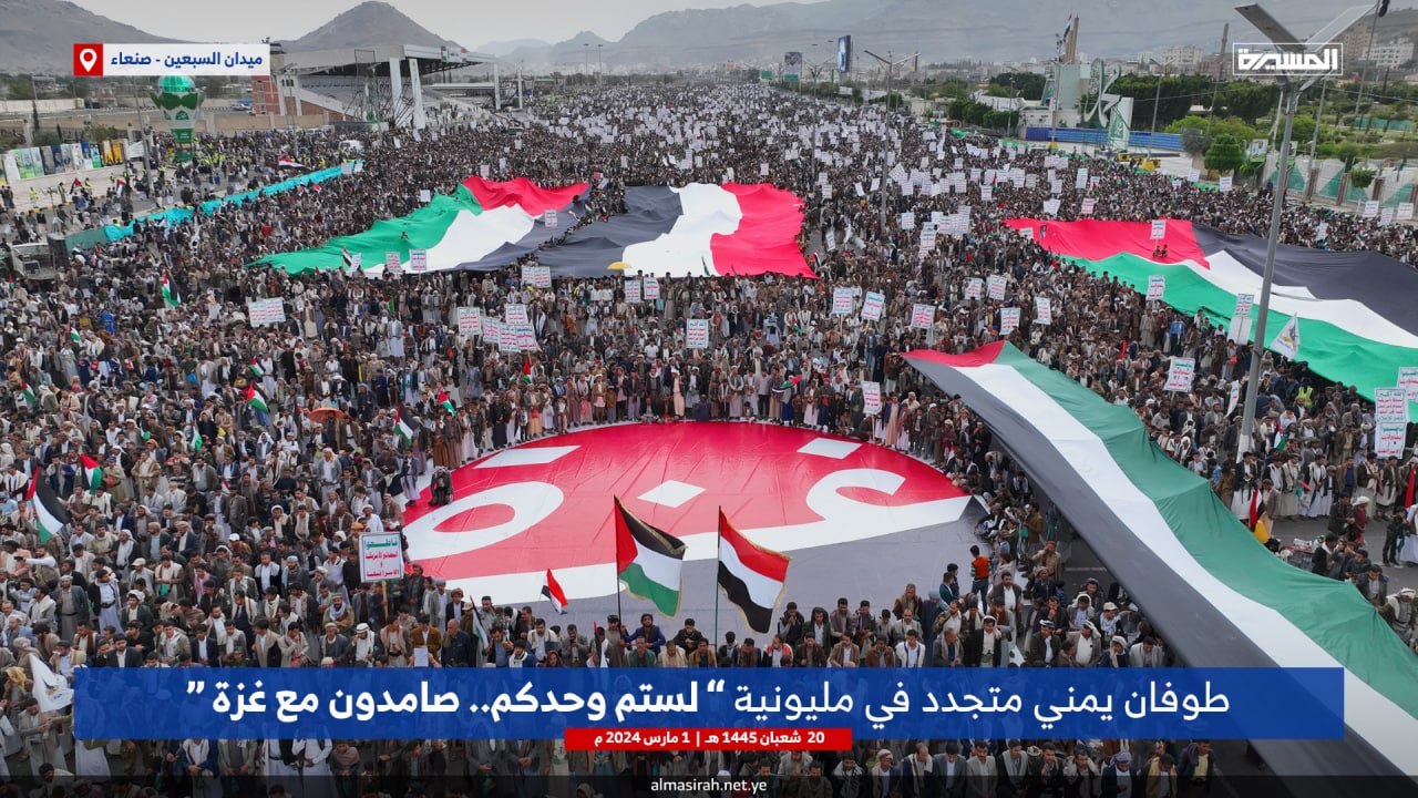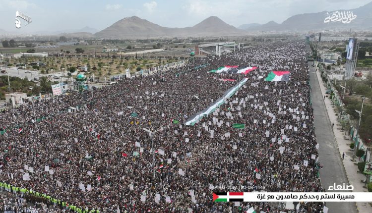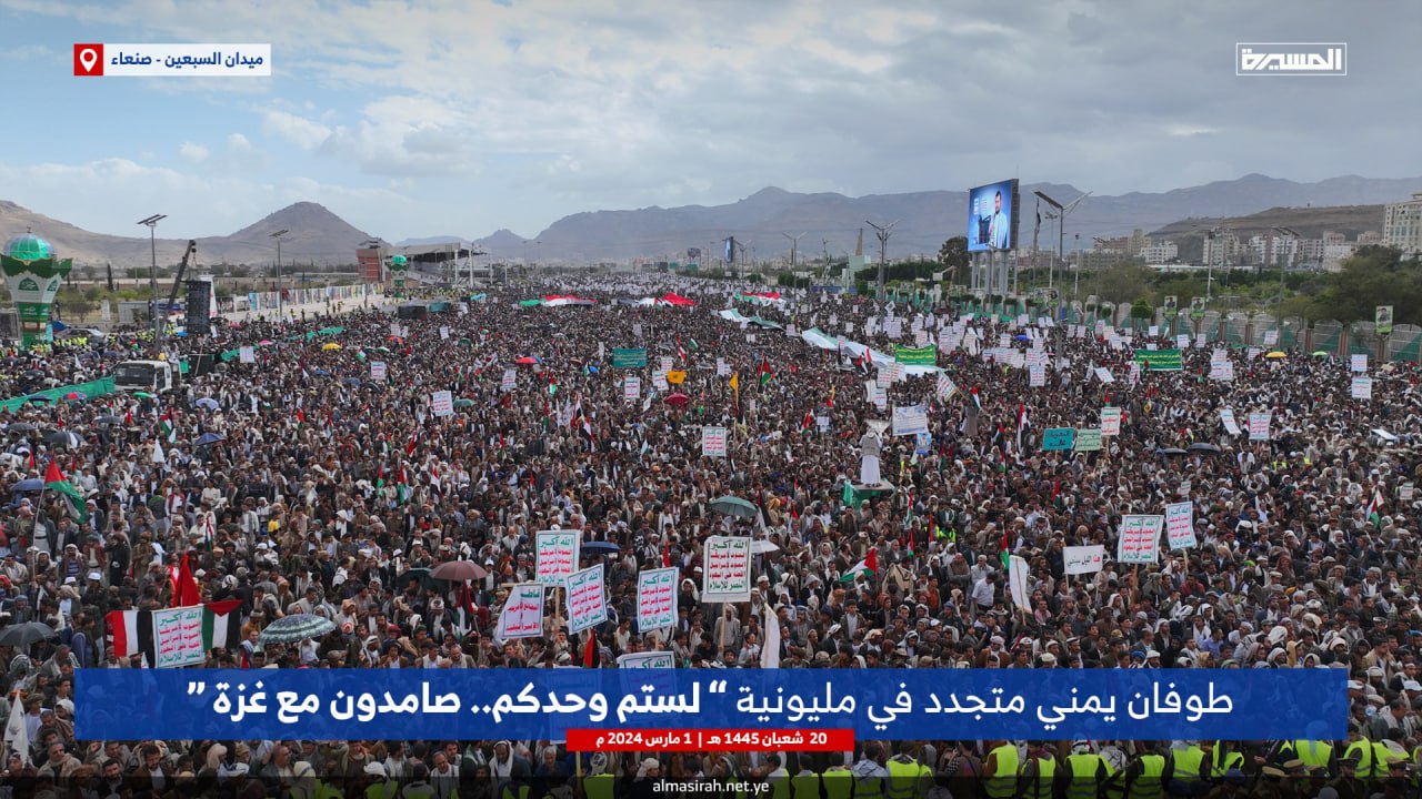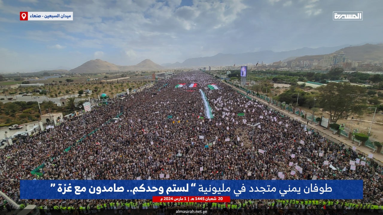صور جوية| بمعنويات عالية تناطح الجبال وتتحدى ثلاثي الشر.. حشود مليونية في مسيرة “لستم وحدكم.. صامدون مع غزة” في ميدان السبعين بالعاصمة صنعاء 20-08-1445هـ – 01-03-2024م