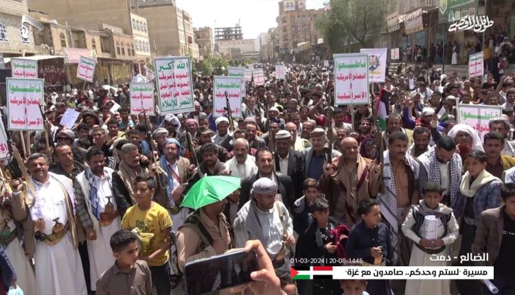 ورفع المشاركون في المسيرة بمديرية دمت، التي تقدّمها القائم بأعمال محافظ الضالع عبداللطيف الشغدري ومساعد قائد المنطقة العسكرية الرابعة العميد صالح حاجب العلم الفلسطيني، مؤكدين استمرار التعبئة والتحشيد وإقامة المسيرات والمظاهرات والوقفات مع الشعب الفلسطيني حتى تحقيق النصر.