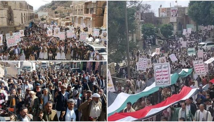 ورفعوا المشاركون في المسيرات، العلمين اليمني والفلسطيني وشعارات ولافتات منددة بحرب الإبادة الجماعية والجرائم التي يرتكبها العدوان الأمريكي الصهيوني بحق المدنيين والأطفال والنساء في غزة والأراضي المحتلة.