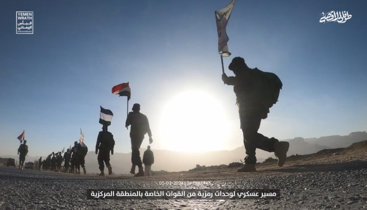 نفذت وحدات رمزية من القوات الخاصة بالمنطقة المركزية، مسير عسكري من العاصمة صنعاء إلى مديرية مدغل بمحافظة مأرب.