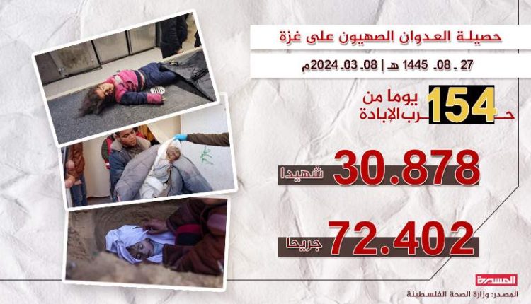 وأفادت الوزارة بارتفاع حصيلة ضحايا العدوان الصهيوني على غزة منذ السابع من أكتوبر الفائت إلى 30.878 شهيدا و72.402 مصابا، ️72 % من بينهم أطفال والنساء.