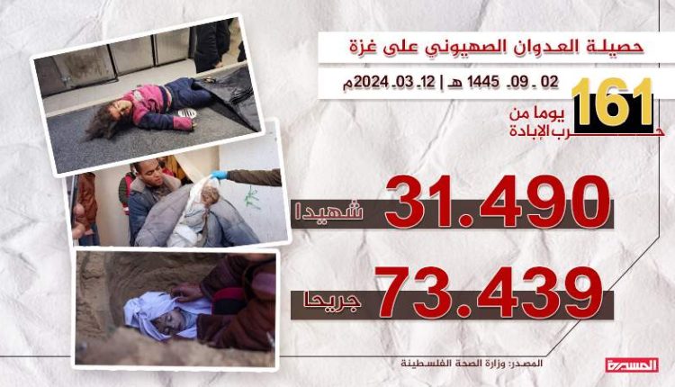 وفي التقرير الاحصائي اليومي لعدد الشهداء والجرحى جراء العدوان الصهيوني المستمر لليوم ال 161 على قطاع غزة، أوضحت الوزارة أن العدو ارتكب 13 مجزرة ضد العائلات في قطاع غزة راح ضحيتها 149 شهيدا و300 جريح خلال ال 24 ساعة الماضية.