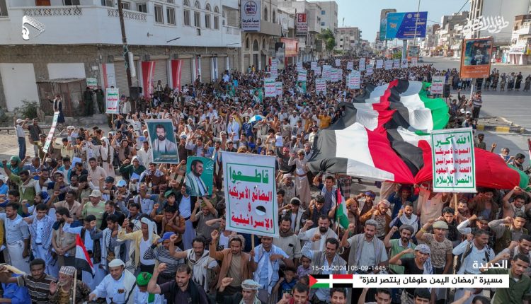 احتشد أبناء محافظة الحديدة، اليوم في تسع ساحات في مسيرات جماهيرية كبرى تضامنا مع الشعب الفلسطيني وتأكيدا على الاستعداد للنفير في مواجهة العدو الأمريكي والبريطاني، تحت شعار “رمضان اليمن طوفان ينتصر لغزة”.