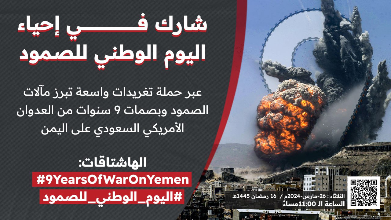 ودعا منظمو الحملة، الناشطين وأحرار العالم إلى المشاركة الواسعة في حملة التغريدات بمناسبة اليوم الوطني للصمود في وجه العدوان، لإبراز مآلات الصمود ومظاهر تسع سنوات من العدوان الأمريكي السعودي على اليمن وذلك على الهاشتاقات: