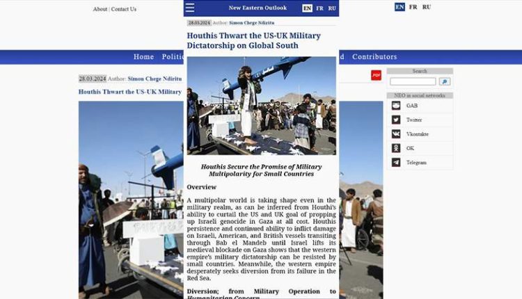 قالت صحيفة (التوقعات الشرقية الجديدة) الروسية: إن عالم متعدد الأقطاب يتشكل حتى في المجال العسكري، كما يمكن استنتاجه من قدرة أنصار الله على تقليص هدف الولايات المتحدة والمملكة المتحدة المتمثل في دعم الإبادة الجماعية الإسرائيلية في غزة بأي ثمن، إن إصرار اليمنيين واستمرار قدرتهم على إلحاق الضرر بالسفن الإسرائيلية والأمريكية والبريطانية التي تمر عبر باب المندب حتى ترفع إسرائيل حصارها الذي فرضته على غزة ، ويُظهر أن الدكتاتورية العسكرية للإمبراطورية الغربية يمكن مقاومتها من قبل الدول الصغيرة، وفي الوقت نفسه، تسعى الإمبراطورية الغربية بشدة إلى صرف الانتباه عن فشلها في البحر الأحمر.