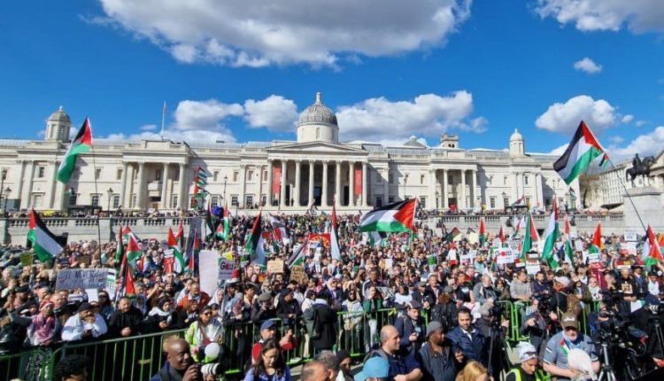 في العاصمة البرطانية لندن، سارت المسيرة التضامنية، والتي قُدِّر عدد المشاركين فيها بعشرات الآلاف، مسافة كيلومترين وسط العاصمة، بحيث وصلت إلى ميدان “ترافلغار سكوير”، في وسط لندن، وهو أكبر ميادين العاصمة البريطانية. ومن المقرر أن يستمر التجمع في الميدان المذكور، في وقفة احتجاجية، حتى ساعات المساء.