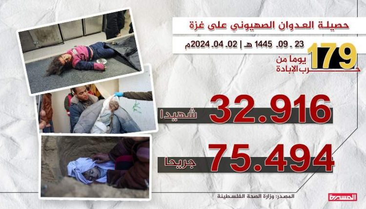 وأوضحت الوزارة أن حصيلة ضحايا العدوان الصهيوني على غزة منذ السابع من أكتوبر ارتفعت إلى 32.916 شهيدا و75.494 إصابة.
