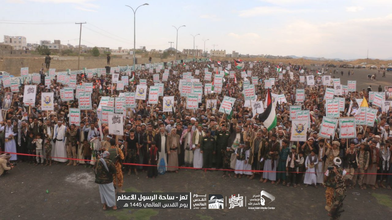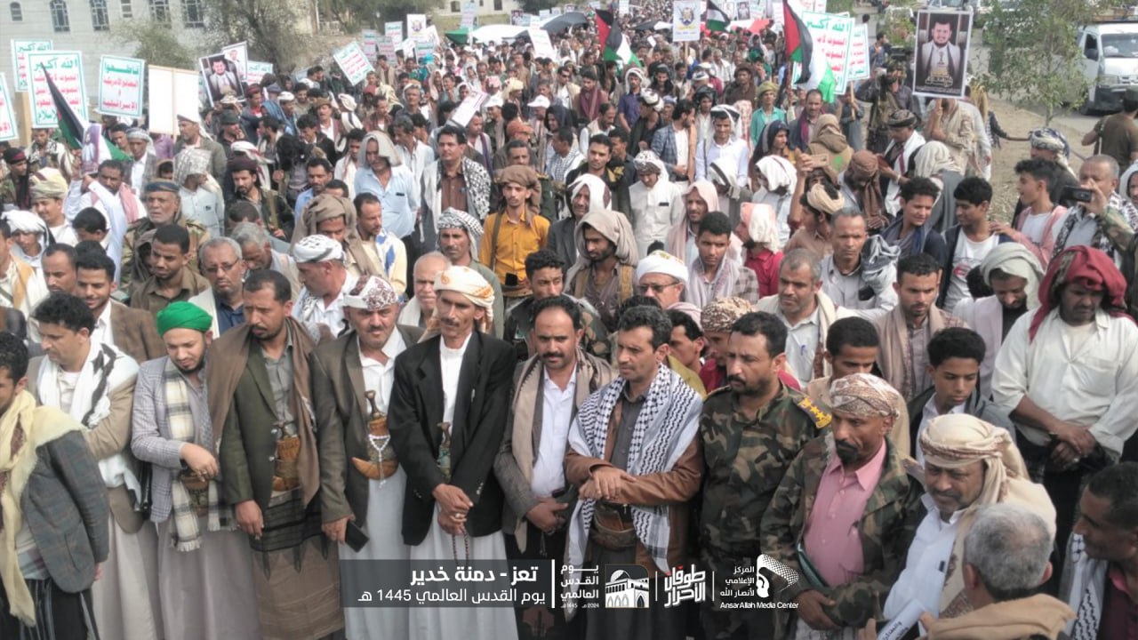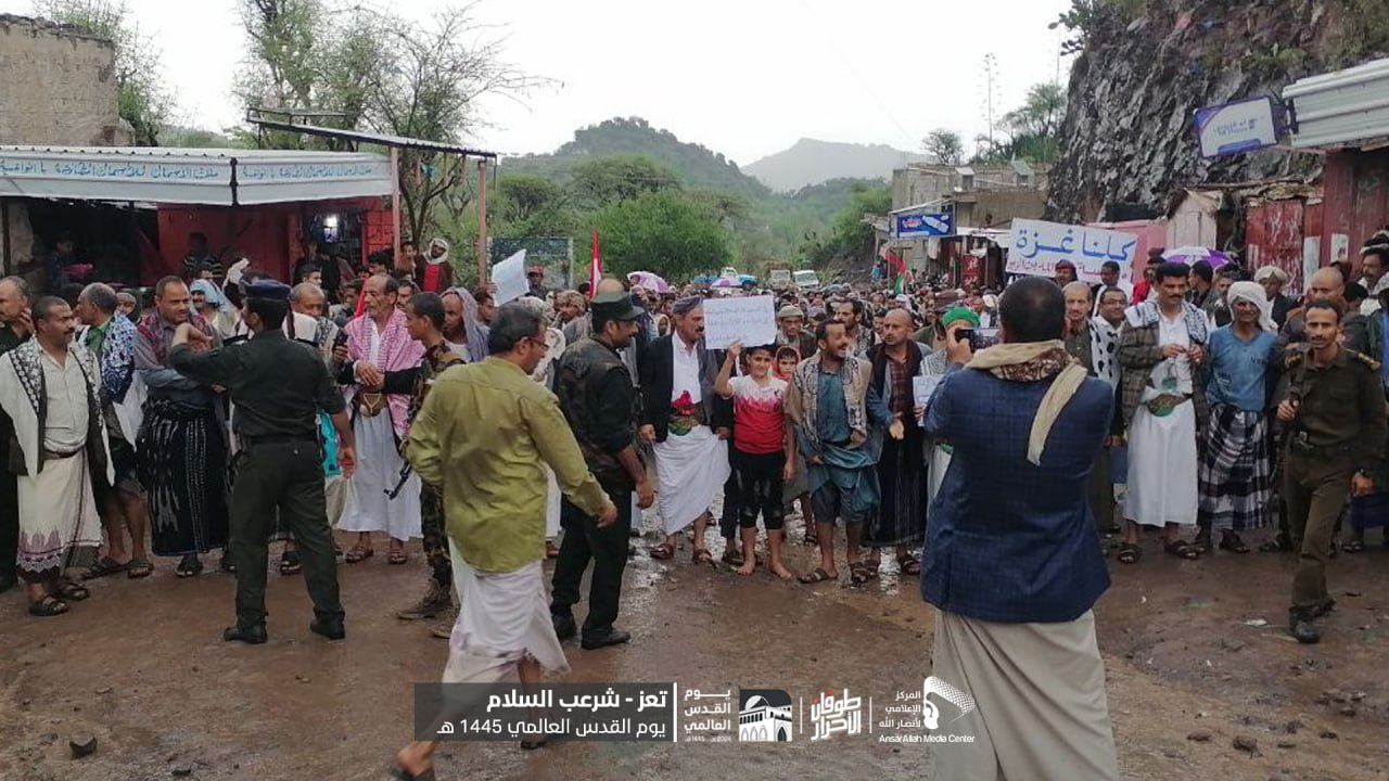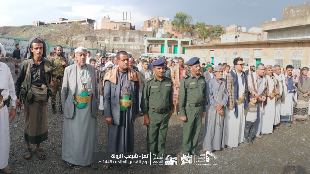 واعتبر أبناء تعز يوم القدس العالمي، آخر جمعة من شهر رمضان، مناسبة إسلامية مهمة تعزّز في النفوس الارتباط بالقدس ويوماً محورياً لاستنهاض الشعوب الإسلامية ورفع وعيها للإحساس بالمسؤولية تجاه قضيتها المركزية.
