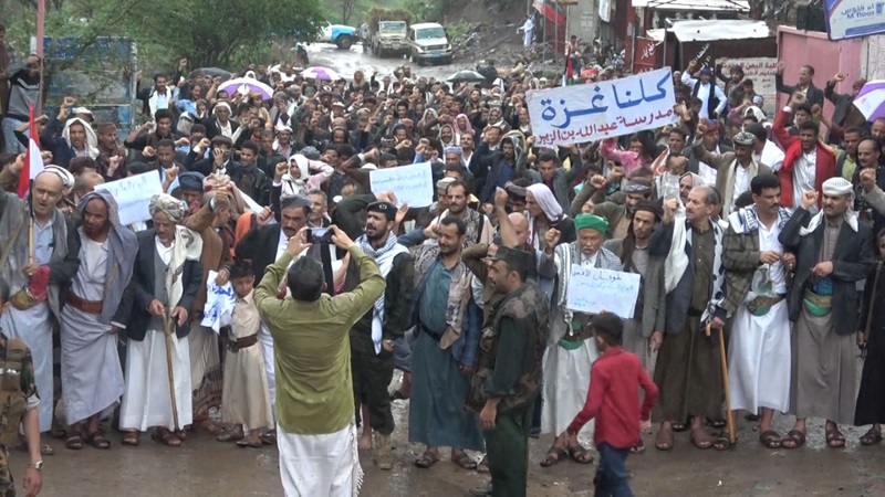 ففي ساحة الرسول الأعظم بمديرية التعزية بمشاركة القائم بأعمال محافظ تعز أحمد أمين المساوى، وعضو مجلس الشورى محمود الجنيد ورئيس محكمة الاستئناف القاضي عبدالعزيز الصوفي، ووكلاء المحافظة ومدير الأمن، ردد المشاركون شعارات البراءة من أعداء الله ولافتات منددة بجرائم العدوان الأمريكي الصهيوني البريطاني على الشعب الفلسطيني منذ ستة أشهر.