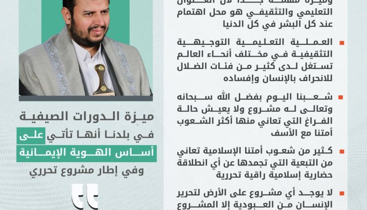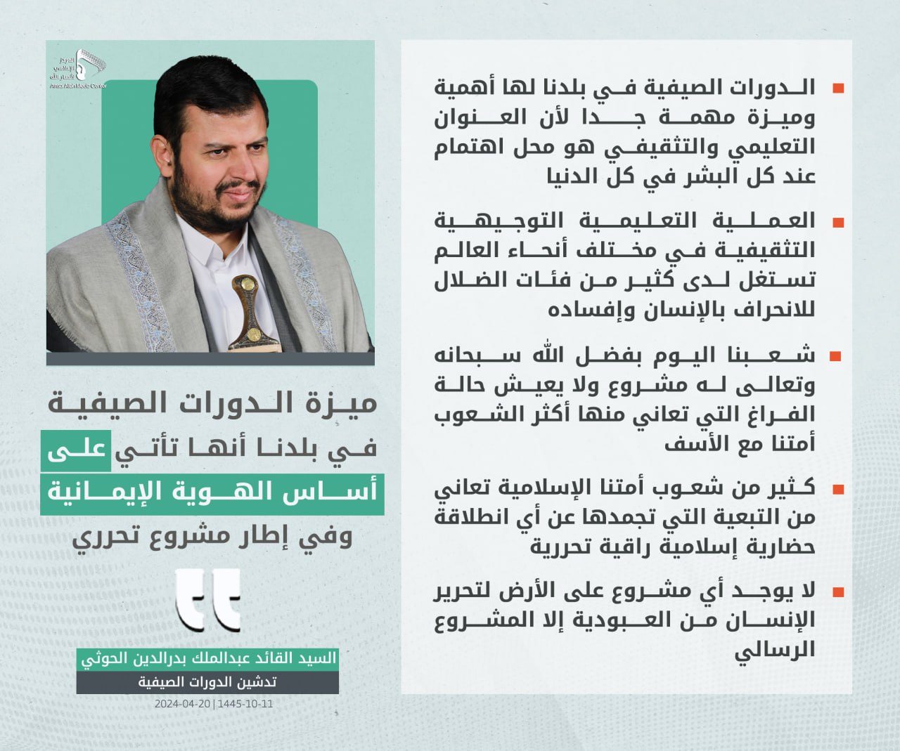 صور السيد القائد: ميزة الدورات الصيفية في بلدنا أنها تأتي على أساس الهوية الإيمانية وفي إطار مشروع تحرري يمانيون/ صور السيد عبدالملك بدرالدين الحوثي: ميزة الدورات الصيفية في بلدنا أنها تأتي على أساس الهوية الإيمانية وفي إطار مشروع تحرري # السيد القائد# تدشين الدورات الصيفية#السيد عبدالملك بدرالدين الحوثي Share