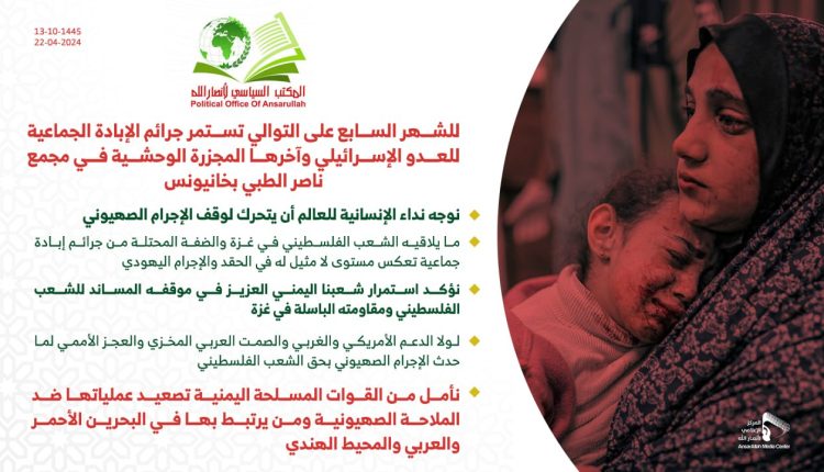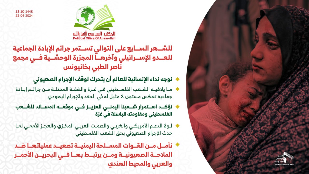 المكتب السياسي لأنصار الله: نؤكد استمرار شعبنا في موقفه المساند للشعب الفلسطيني ومقاومته الباسلة في غزة، ونأمل من القوات المسلحة اليمنية تصعيد عملياتها ضد الملاحة الصهيونية