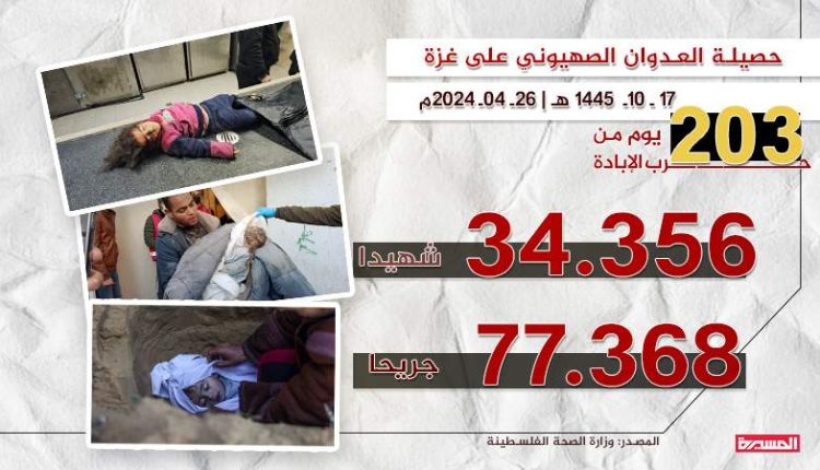وأوضحت الوزارة أن حصيلة ضحايا العدوان الصهيوني على غزة منذ السابع من أكتوبر الماضي ارتفعت إلى 34.356 شهيدا و77.368 إصابة.