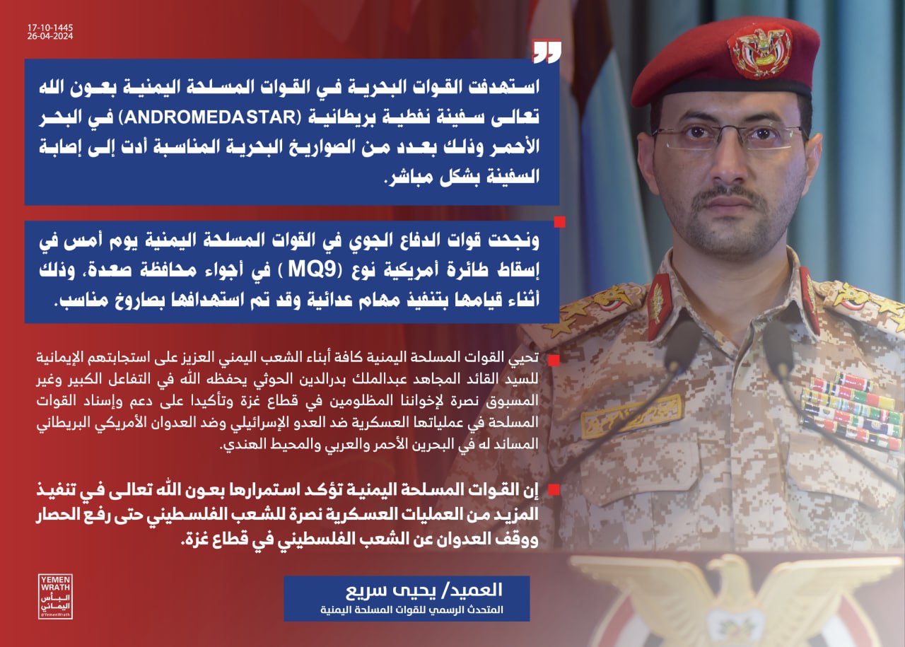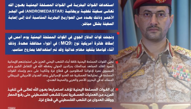 بيان القوات المسلحة اليمنية بشأن استهداف سفينة نفطية بريطانية (ANDROMEDA STAR) وإسقاط طائرة أمريكية MQ9 في أجواء محافظة صعدة