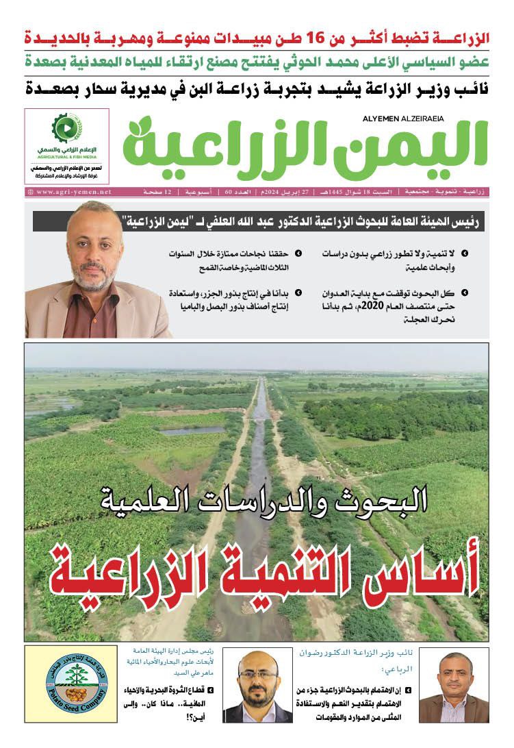 صدر العدد الـ “60” من الصـحيفة الأسبوعية “اليمن الزراعية”، تضمن جملة من المواضيع في التنمية الزراعية فيما يخص البحوث والخامات الزراعية وتشجيع تنمية الإنتاج المحلي من البذور والأصناف المحلية.