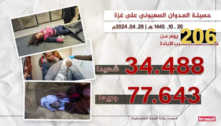 وفي التقرير الاحصائي اليومي لعدد الشهداء والجرحى جراء العدوان الصهيوني المستمر لليوم الـ 206 على قطاع غزة، أوضحت الوزارة أنه وصول المستشفيات 34 شهيدا و68 مصابا في 3 مجازر ارتكبتها قوات العدو الصهيوني في قطاع غزة خلال ال 24 ساعة الماضية.