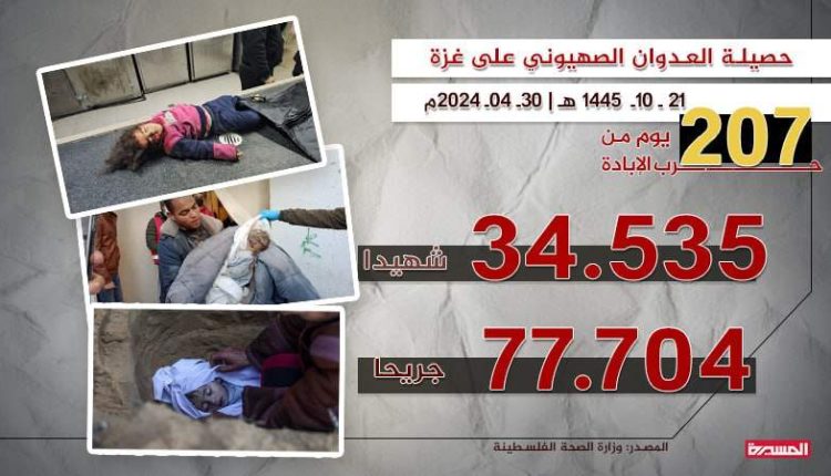 وأعلنت وزارة الصحة الفلسطينية بغزة في تحديثها اليومي، ارتفاع حصيلة العدوان الإسرائيلي على القطاع إلى 34535 شهيدًا و77704 إصابات منذ 7 أكتوبر الماضي.