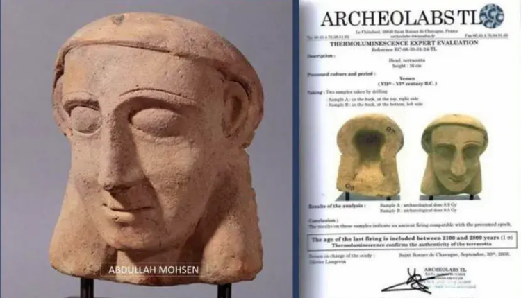 وقال: إن “شاهدة جنائزية أثرية من الفَخَّار التراكوتا من آثار اليمن هُربت إلى فرنسا، وفحصت هناك في العام 2008م في معامل أرتشيولابز إل تي، وهي شركة فرنسية متخصصة في فحص الآثار والتحقق منها”.