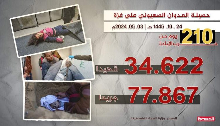 وأوضحت الوزارة أن حصيلة ضحايا العدوان الصهيوني على غزة منذ السابع من أكتوبر الماضي ارتفعت إلى 34.622 شهيدا و77.867 إصابة.