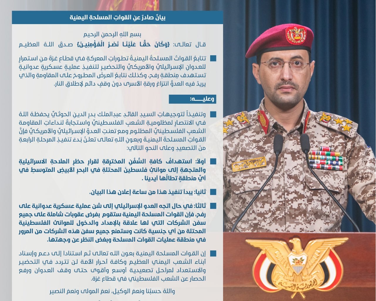 صور شاهد| بيان القوات المسلحة عن بدء المرحلة الـ4 من التصعيد (إنفوجرافيك) يمانيون/ صور شاهد| بيان القوات المسلحة عن بدء المرحلة الـ4 من التصعيد (إنفوجرافيك) # القوات المسلحة اليمنية#العدوان الصهيوني على غزة#المرحلة الرابعة من التصعيدً#اليمن#بيان Share