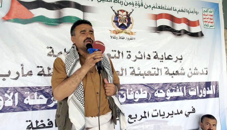 دشنت التعبئة العامة في محافظة مأرب، اليوم، المرحلة الأولى من الدورات العسكرية المفتوحة “طوفان الأقصى” في مديريات المربع الجنوبي، دعماً واسناداً للشعب الفلسطيني.