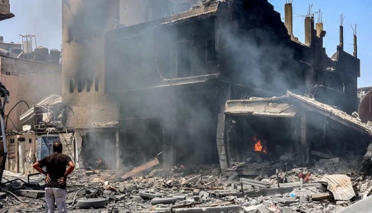 صور مواطن فلسطيني يقف أمام منزله الذي يحترق نتيجة غارات الطيران الإسرائيلي له في حي الزيتون بغزة Share