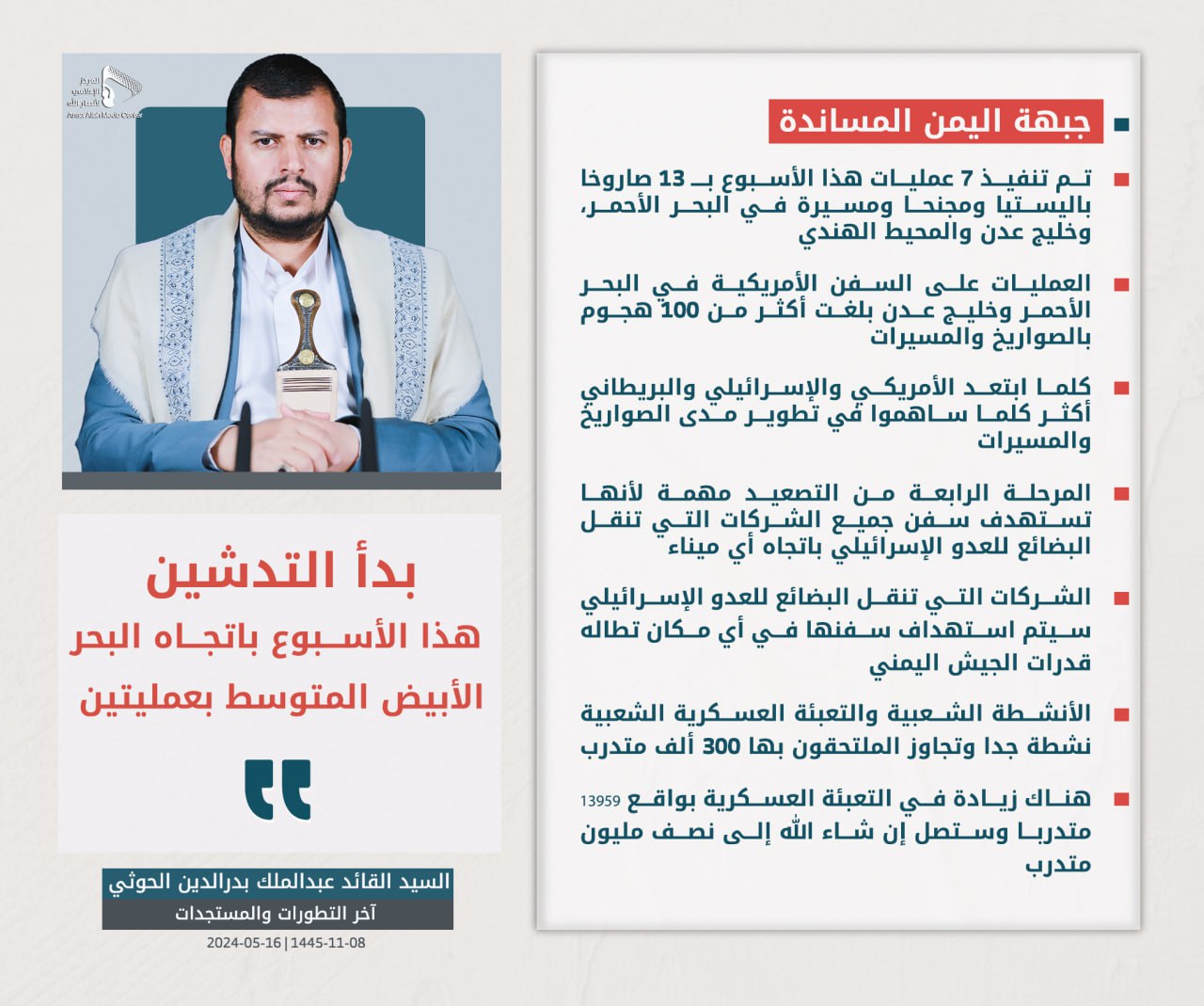 صور مستجدات جبهة اليمن المساندة للشعب الفلسطيني (إنفوجرافيك) يمانيون/ صور مستجدات جبهة اليمن المساندة للشعب الفلسطيني (إنفوجرافيك) #البحر الأبيض المتوسط#السيد عبدالملك بدرالدين الحوثي#العدوان الصهيوني على غزة#العمليات العسكرية اليمنيةً#اليمن#جبهة اليمن Share