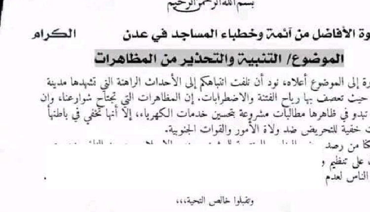 تداول ناشطون على مواقع التواصل الاجتماعي وثيقة منسوبة لمدير الأوقاف بعدن المحتلة بعنوان التنبيه والتحذير من المظاهرات تتهم الوثيقة بأن المحتجين من أبناء عدن على أنهم ينتمون للإصلاح ومن النازحين.