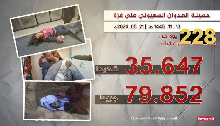 وأفادت الوزارة في تقريرها اليومي لعدد الشهداء والجرحى جراء العدوان الصهيوني المستمر لليوم الـ 228 ،بارتفاع حصيلة العدوان إلى 35647 شهيدا و79852 إصابة منذ السابع من أكتوبر الماضي.