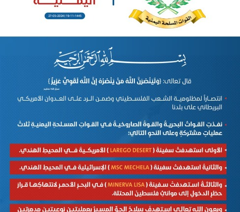 شاهد| بيان القوات المسلحة بشأن تنفيذ 3 عمليات مشتركة ضد 3 سفن وعمليتين نوعيتين استهدفت مدمرتين حربيتين أمريكيتين (إنفوجرافيك)