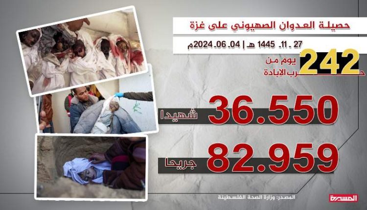 أفادت الوزارة بارتفاع حصيلة العدوان الصهيوني إلى 36 ألفا و 550 شهيدا و82 ألفا و959 مصابا منذ السابع من أكتوبر الماضي.