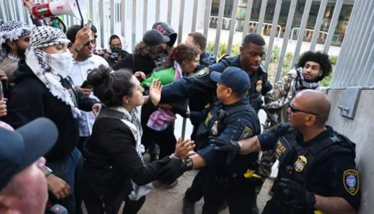 وزعمت الشرطة المحلية أن الضباط رأوا سبباً لاعتقال المشتبه بهم الذين رفضوا إخلاء المبنى، فيما دعا المتظاهرون إلى مقاطعة إسرائيل، وعدم إعطاء دولار آخر للمجزرة “الإسرائيلية”.
