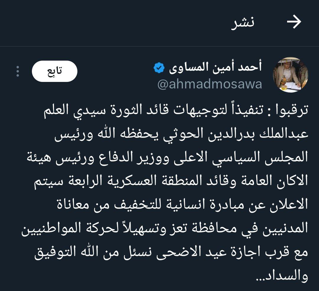 وأوضح المساوى في تدوينة له، اليوم الخميس، على منصة “إكس”، أن المبادرة تأتي تنفيذاً لتوجيهات قائد الثورة السيد عبدالملك بدرالدين الحوثي – يحفظه الله -، وكذا توجيهات القيادة السياسية والعسكرية.. مؤكداً أن هذه المبادرة ستعمل على تسهيل حركة المواطنين خصوصًا مع اقتراب عيد الأضحى المبارك.