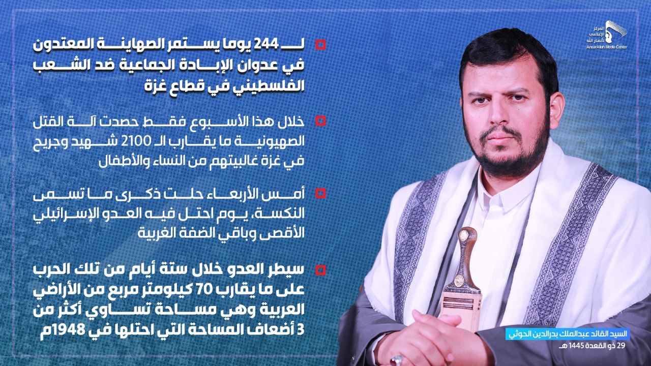 صور السيد القائد: أمس الأربعاء حلت ذكرى ما تسمى النكسة يوم احتل فيه العدو الإسرائيلي الأقصى وباقي الضفة الغربية يمانيون/ صور السيد عبدالملك بدرالدين الحوثي: أمس الأربعاء حلت ذكرى ما تسمى النكسة يوم احتل فيه العدو الإسرائيلي الأقصى وباقي الضفة الغربية # السيد القائد#السيد عبدالملك بدرالدين الحوثي#ذكرى النكسة Share
