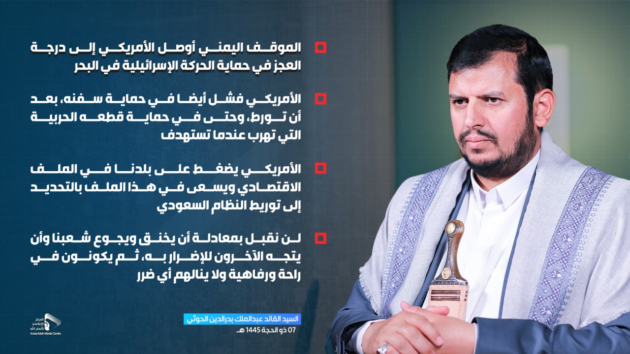 صور السيد القائد: لن نقبل بمعادلة أن يخنق ويجوع شعبنا وأن يتجه الآخرون للإضرار به، ثم يكونون في راحة ورفاهية ولا ينالهم أي ضرر يمانيون/ صور لن نقبل بمعادلة أن يخنق ويجوع شعبنا وأن يتجه الآخرون للإضرار به، ثم يكونون في راحة ورفاهية ولا ينالهم أي ضرر Share