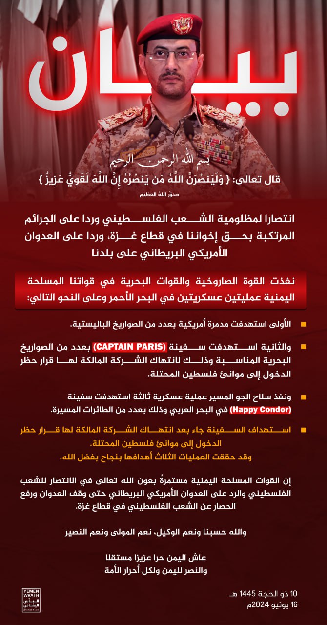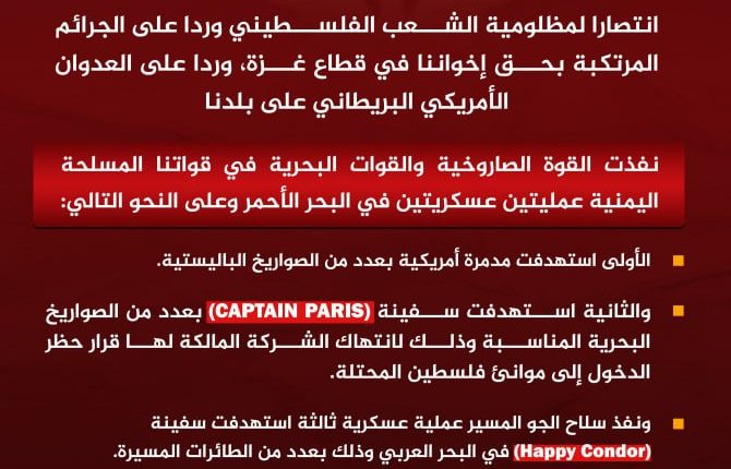 بيان القوات المسلحة اليمنية بشأن تنفيذ ثلاث عمليات عسكرية استهدفت مدمرة أمريكية وسفينتين في البحرين الأحمر والعربي (إنفوجرافيك)
