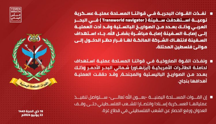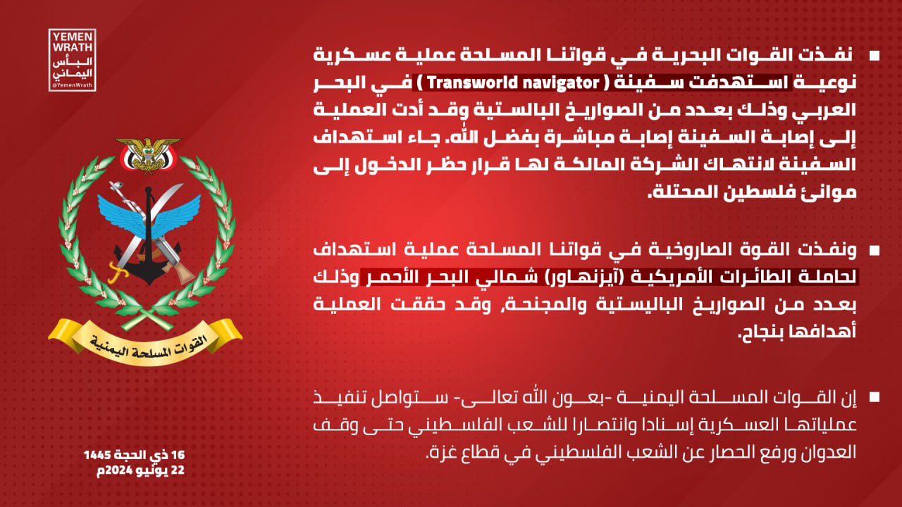 بيان القوات المسلحة اليمنية بشأن بشأن تنفيذ عمليتين عسكريتين استهدفت سفينة (Transworld navigator) في البحر العربي، وحاملة الطائرات الأمريكية (آيزنهاور) شمالي البحر الأحمر