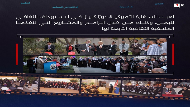 كثَّفت السفارةُ الأمريكيةُ في العاصمة صنعاءَ، خلال تواجُدِها إبان الأنظمة السابقة، من استهداف الشعب اليمني في كافة الجوانب، وعلى رأسها الجانب الثقافي.
