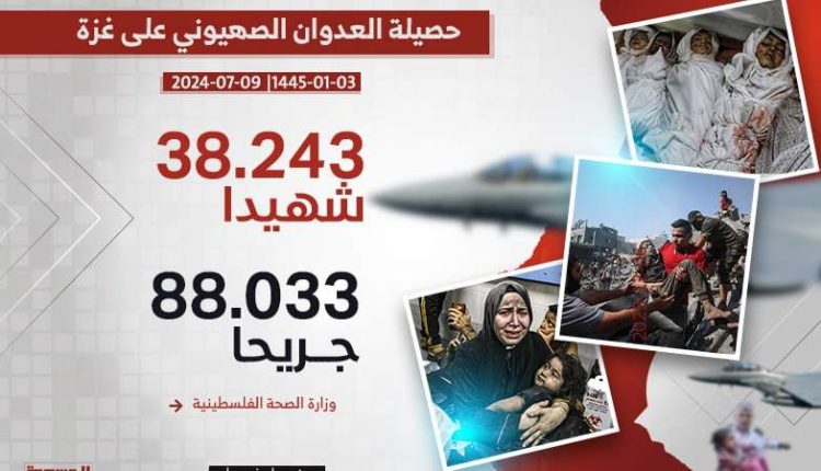 وأفادت بارتفاع حصيلة العدوان الصهيوني إلى 38243 شهيداً و88033 إصابة منذ السابع من أكتوبر الماضي.