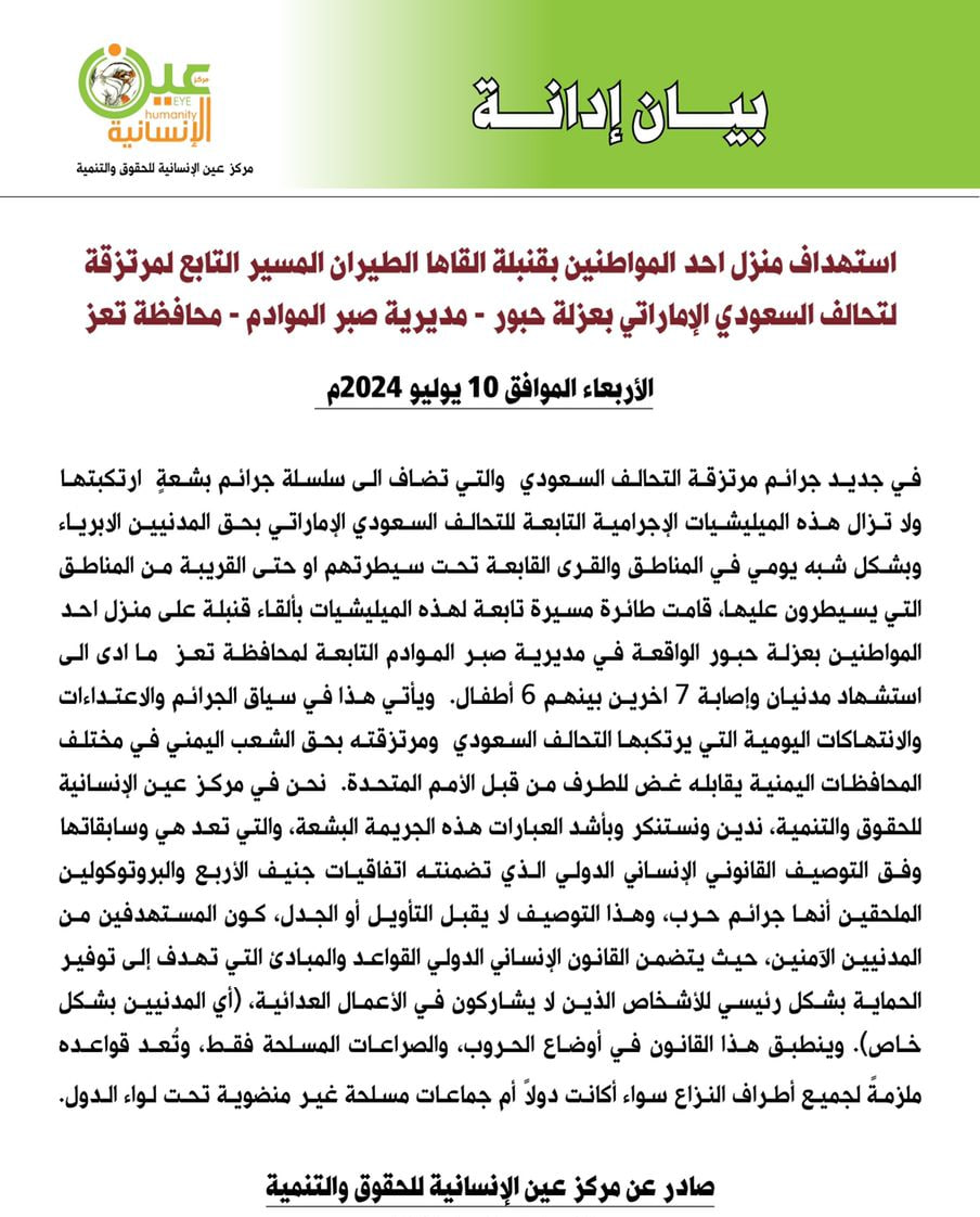 وستهجن مركز عين الإنسانية في بيان له هذه الجريمة والتي تأتي في سياق الجرائم والاعتداءات والانتهاكات اليومية التي يرتكبها التحالف السعودي ومرتزقته بحق الشعب اليمني في مختلف المحافظات اليمنية يقابله غض للطرف من قبل الأمم المتحدة.