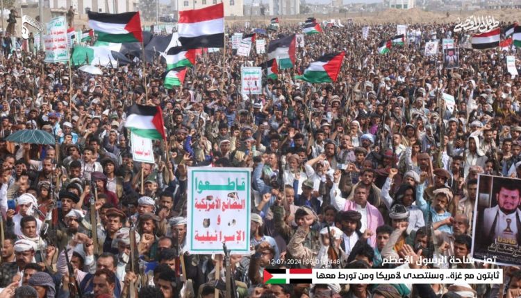 خرجت جماهير كبرى اليوم في عشر ساحات بمديريات محافظة تعز، بعنوان “ثابتون مع غزة .. وسنتصدى لأمريكا ومن تورط معها”، تضامناً مع الشعب الفلسطيني ونصرة غزة.