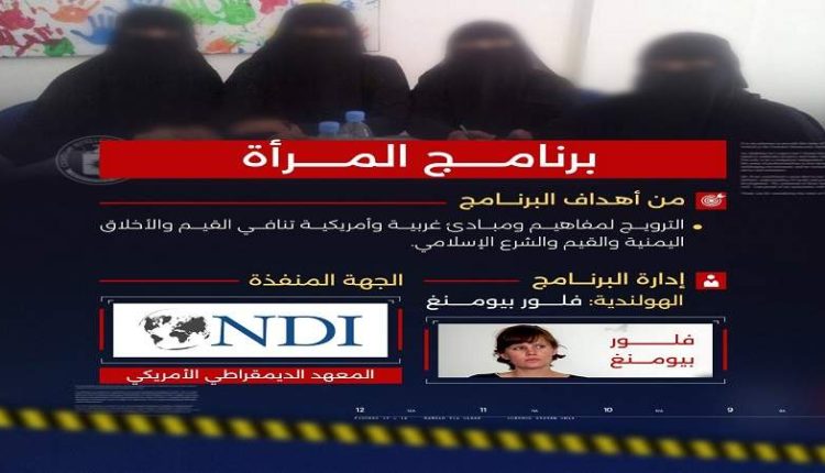 وفي السياق يقول الجاسوس عبد المعين عزان، إن برنامج المرأة في المعهد الديمقراطي الذي كانت تديره خبيرة هولندية تدعى فلور بيومنغ، كان على أساس أنه يقدم الدعم للمرأة وللقيادات النسوية، لكنه كان يستهدف المرأة اليمنية، ومن خلاله يدفع بأجندة أمريكية، وأجندة غربية، فيها مفاهيم كثيرة تهدف إلى تناقض الأسلاف والأعراف والتقاليد اليمنية وحتى الشرع الإسلامي، واسُتخدم في سبيل ذلك وسيلة استقطاب قيادات نسوية، وهذا كجانب مخابراتي لعمل البرنامج”.