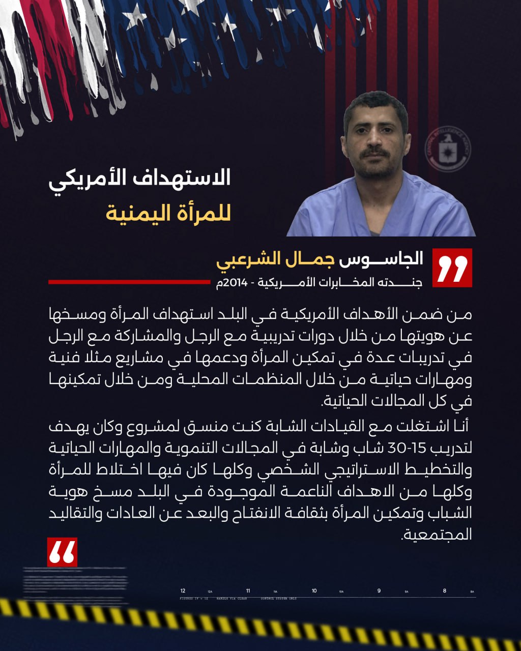 ويوضح الجاسوس شايف أنه كان يتم في هذه الاجتماعات تحريك عناوين تقوية وضع المرأة في اليمن ودعمها بشتى الوسائل، بحجة أنها تستحق أن تأخذ حقوقها في المجتمع، وكان الهدف الرئيسي هو تثوير المرأة وجعلها تتمرد على أسرتها، وهذا يحدث شرخاً اجتماعياً في المجتمع اليمني، يؤدي إلى تفكك الأسرة، وتفسخ المجتمع وتفككه، بذريعة دعوة الحرية للمرأة، مؤكداً أن ذلك كان ضمن من الأهداف الرئيسية لتلك الاجتماعات التي كان يحضرها الجاسوس ويكتب عنها محاضر ويشاركها مع مدير مكتب البرامج، وبقية موظفي الوكالة الأمريكية للتنمية الدولية، التي كانت تعقد هذه الاجتماعات كل 4 أشهر إلى 3 أشهر.
