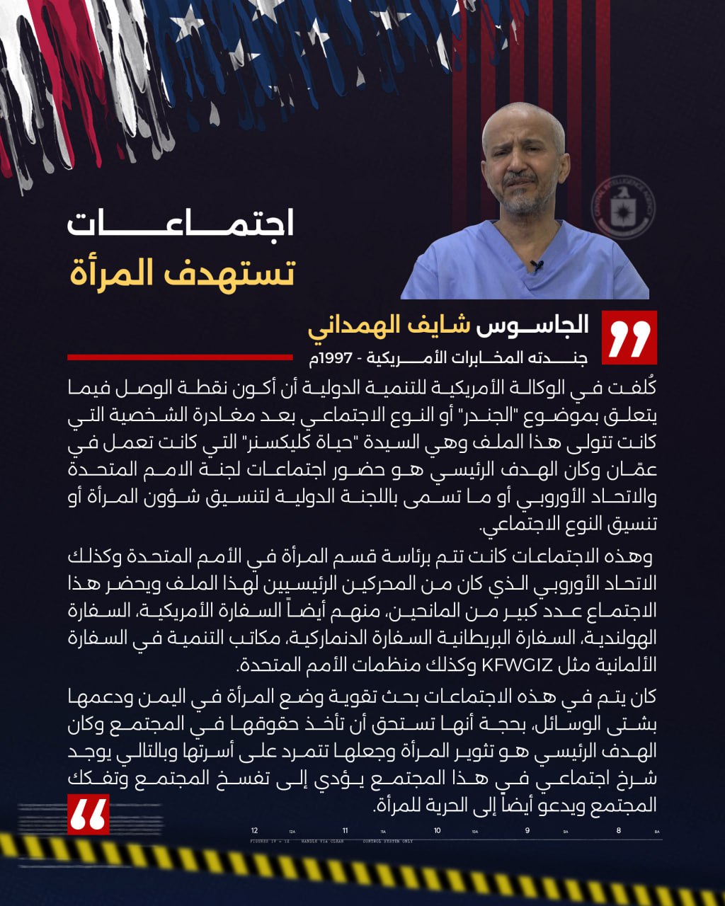 أما عن الأنشطة المشبوهة لما تسمى الوكالة الأمريكية للتنمية الدولية ودورها في استهداف المرأة اليمنية، يقول الجاسوس شايف الهمداني :”كُلفت في الوكالة الأمريكية للتنمية الدولية أن أكون نقطة الوصل فيما يتعلق بموضوع “الجندر” أو النوع الاجتماعي بعد مغادرة الشخصية التي كانت تتولى هذا الملف، وهي السيدة “حياة كليكسنر” التي كانت تعمل في عمًان، وكان الهدف الرئيسي هو حضور اجتماعات لجنة الأمم المتحدة والاتحاد الأوروبي، أو ما تسمى باللجنة الدولية لتنسيق شؤون المرأة أو تنسيق النوع الاجتماعي”.