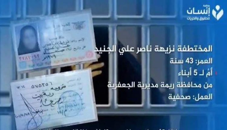 وأضافت المنظمة الحقوقية، أن المواطنة اليمنية المعتقلة “نزيهة” والتي تنتمي إلى محافظة ريمة هي أم لـ 5 أطفال، حيث يرفض ما يسمى الأمن السياسي في مأرب المحتلة إحالتها إلى النيابة أو أي جهة قضائية للعام الثالث على التوالي، ويستمر في احتجازها قسراً بصورة تعسفية ودون أي تهمة.