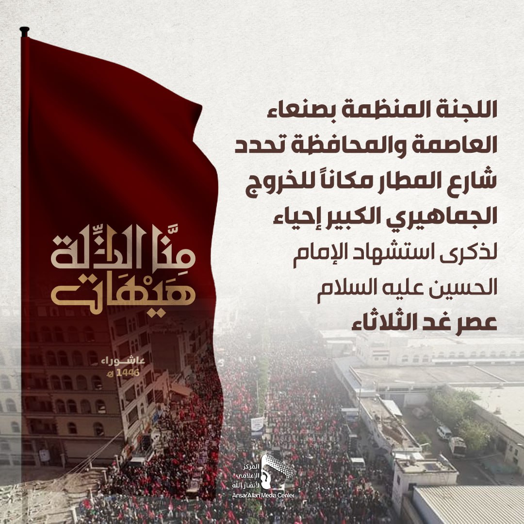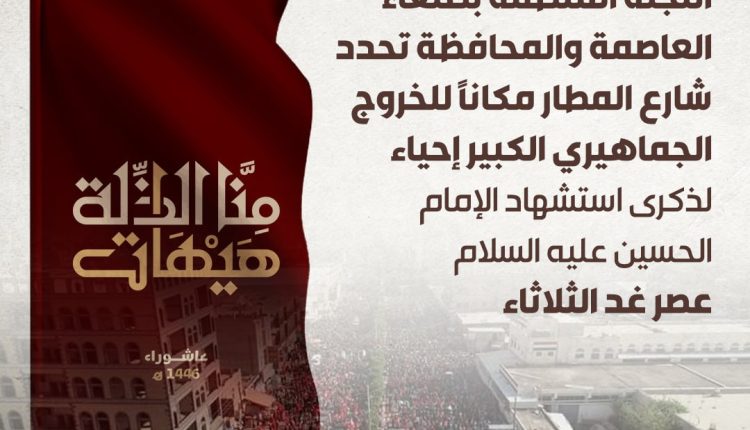 اللجنة المنظمة بصنعاء العاصمة والمحافظة تحدد شارع المطار مكاناً للخروج الجماهيري الكبير إحياء لذكرى استشهاد الإمام الحسين عليه السلام عصر غداً الثلاثاء