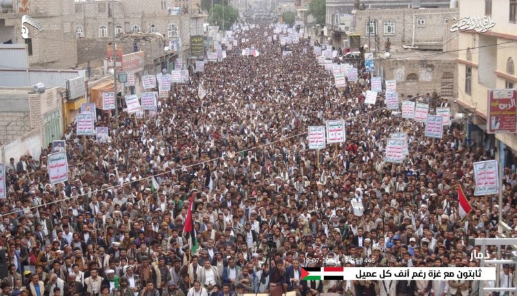 مسيرات جماهيرية حاشدة في ذمار استمراراً للتضامن مع الشعب الفلسطيني ومقاومته الباسلة