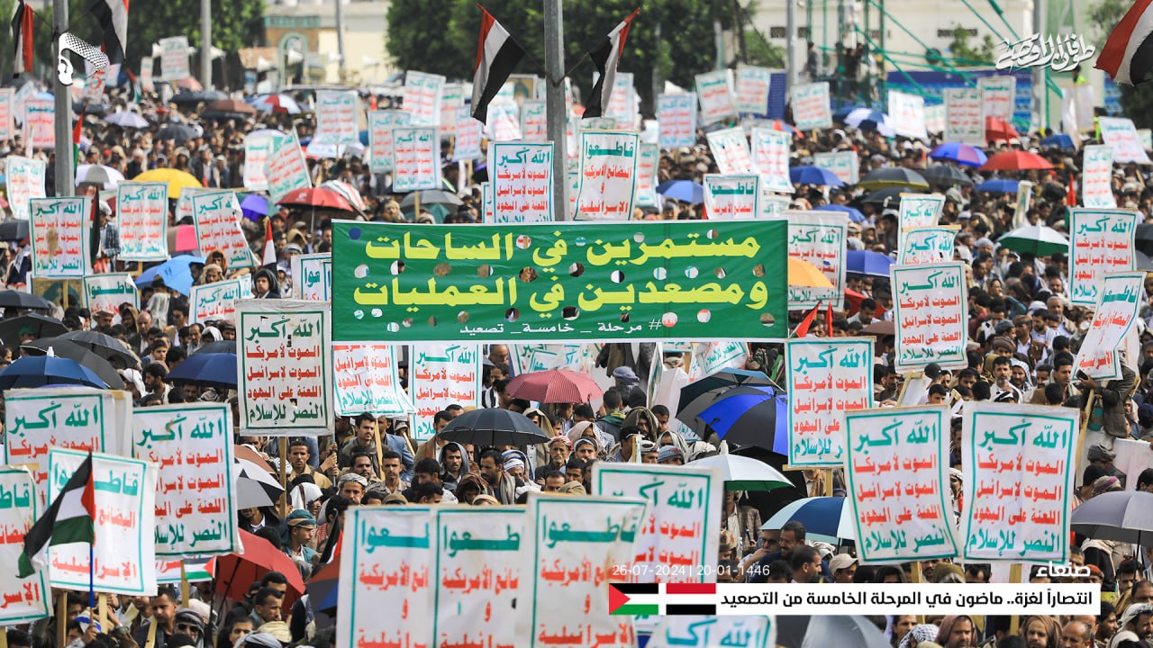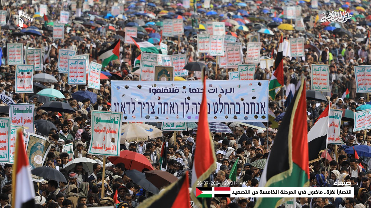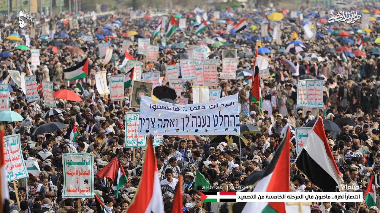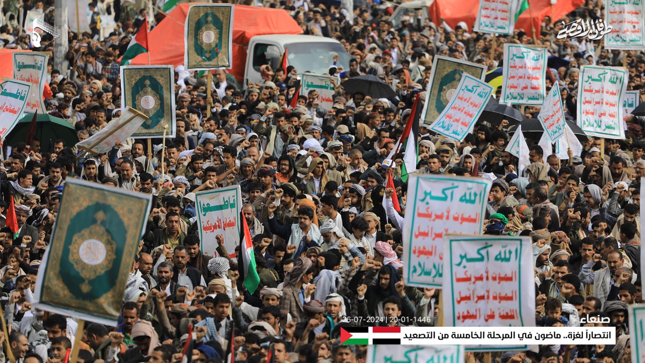 وأعلنت الحشود في المسيرة، حالة الاستنفار الشامل والجهوزية العالية للشعب اليمني واستعداده التام للمواجهة المباشرة مع العدو الإسرائيلي والأمريكي، في إطار معركة الفتح الموعود والجهاد المقدس حتى تحقيق النصر.