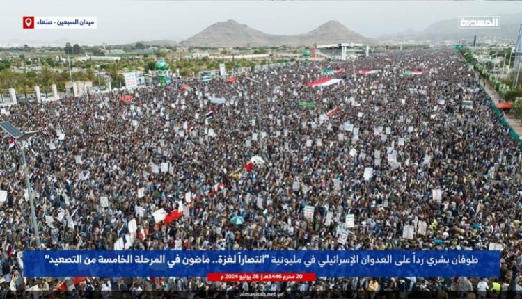 طوفان بشري رداً على العدوان الإسرائيلي في مليونية “انتصارا لغزة.. ماضون في المرحلة الخامسة من التصعيد” بـميدان السبعين في العاصمة صنعاء