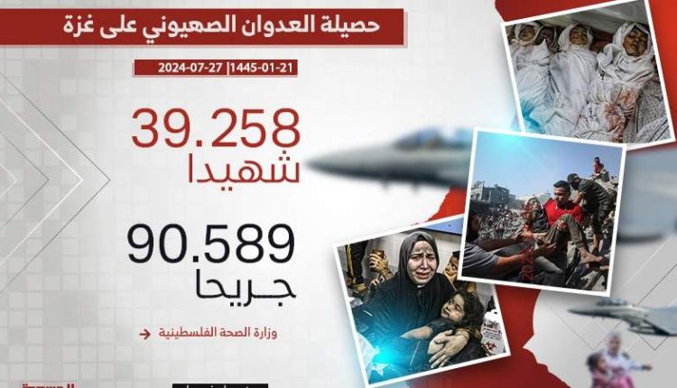 وأعلنت الصحة ارتفاع حصيلة الضحايا إلى 39258 شهيدا و90589 جريحا منذ بدء العدوان الصهيوني على قطاع غزة في 7 أكتوبر الماضي.
